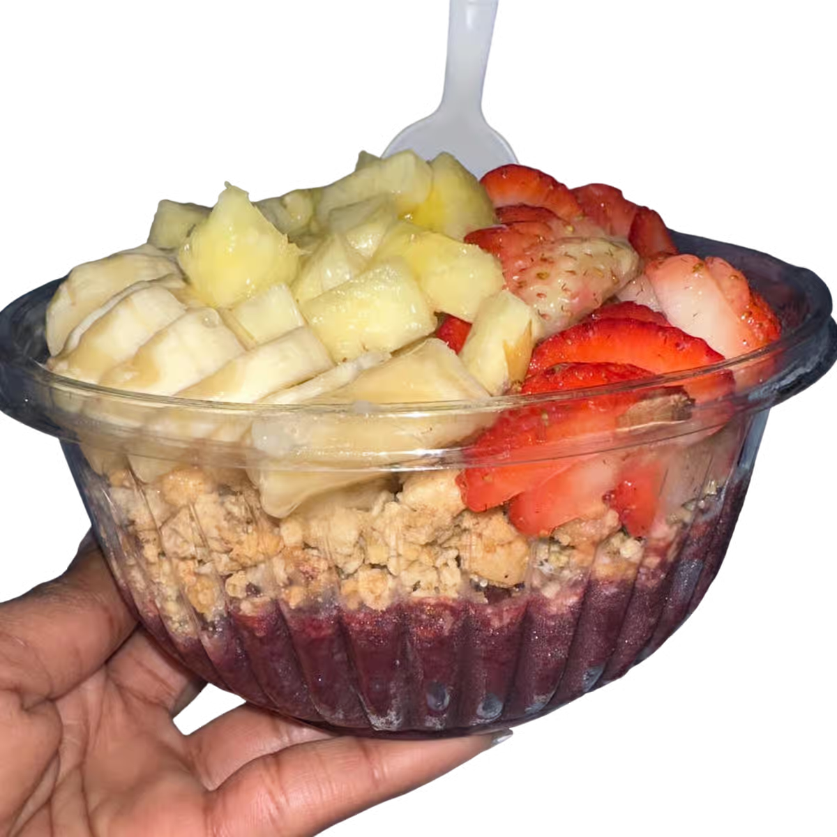 Blended açaí topped with pineapple, banana, granola, strawberry and honey.